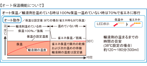 【オート保温機能】輸液剤を温める作業をしている時は「保温モード」、温める頻度が少なくなると自動で「省エネモード」に移行します。次の輸液剤を温め始めると自動で「保温モード」に移行します。保温時は100%、省エネ時は70~80%ですが「省エネ時」も設定温度で輸液剤を保温しています。